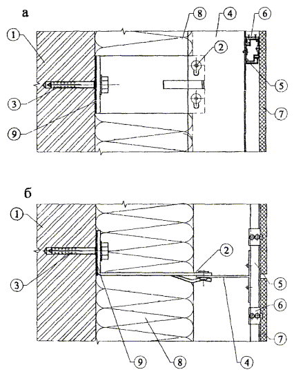 10.6. На кронштейны устанавливаются и крепятся к ним вертикальные профили, которые являются базой для устройства отделочного слоя фасада в пределах проектных допусков. Поэтому установка каждого профиля, его положение в вертикальной плоскости проверяется соответствующими приборами: теодолитом, отвесом и др. Крепление профиля к кронштейну производится заклепками или винтами.