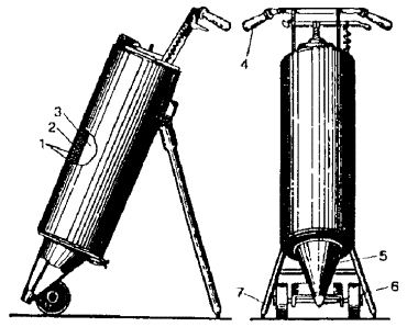1 - кожух; 2 - изоляция; 3 - блок; 4 - рукоятка управления; 5 - конус; 6 - шарик конуса; 7 - колеса.