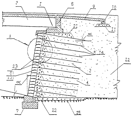 1 - диванный блок; 2 - пролетное строение; 3 - армогрунтовая конструкция; 4 - дренирующий грунт; 5 - армирующие элементы (георешетка «ПРУДОН-494»); 6 - лицевое ограждение; 7 - фундамент; 8 - шкафная стенка; 9 - переходная плита; 10 - лежень; 11 - щебеночная подушка; 12 - насыпь; 13 - стеновые блоки; 14 - ребра; 15 - пазы; 16 - каркасные решетки; 17, 18 - продольные и поперечные стержни; 19 - крепежные гнезда; 20 - геотекстильные полотна; 21 - клинообразная щебеночная подушка; 22 - дренажная труба; 23 - дренажная призма; 24 - горфы; 25 - щебеночная подготовка.