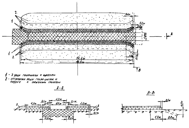 2. Усиление армированием грунтовой обоймы с созданием «упоров» в местах, препятствующих возможной деформации контуров сооружения из гофрированного металла (рис. 2);