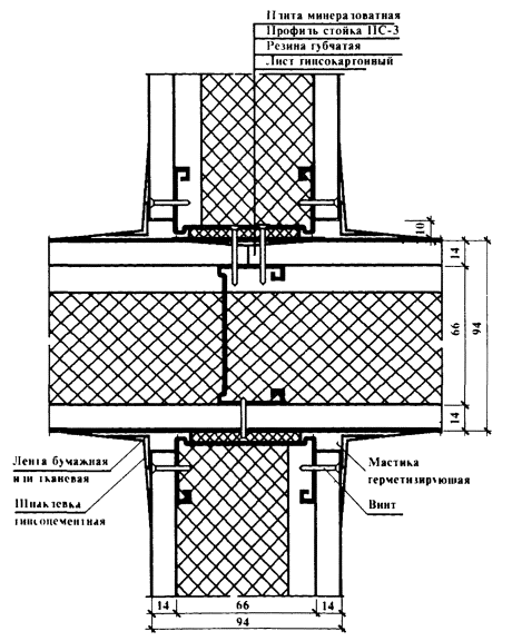перегородки типа ПГКМ-1 толщиной 94 мм с однослойной обшивкой без минераловатного заполнения - для перегородок, к которым не предъявляются какие-либо требования в части звукоизоляции;