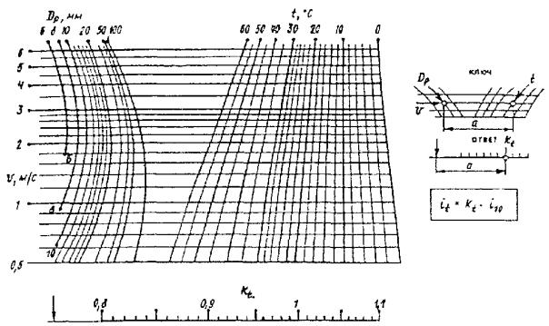 Способ пользования этой номограммой следующий. Значение Кt находится по заданным значениям величин v, Dp и t путем откладывания циркулем или измерителем отрезка, равного данному (см. ключи пользования на номограмме).