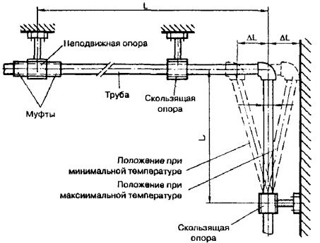 Как при проектировании, так и при монтаже необходимо знать специфику трубопроводной системы, смонтированной из таких труб. К числу специфических особенностей следует прежде всего отнести высокий коэффициент линейного теплового расширения пластмасс, следствием чего является необходимость компенсации изменений длины трубопровода, т.е. расчета компенсаторов и грамотной расстановки как компенсаторов, так и подвижных и неподвижных опор.