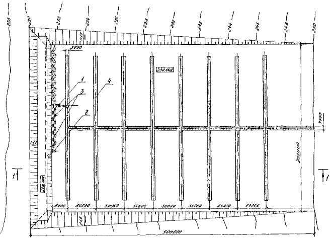 - абсолютная отметка; 3 - временные отвалы грунта, выгруженного