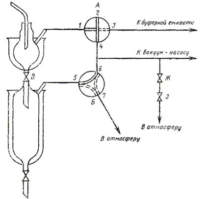 После того, как остаточное давление достигнет 1,3·102 - 2,7·102 Па (1-2 мм рт. ст.), кран А переводят в положения 1, 2, 3, а затем кран Б переводят в положения 6, 7. Вакуумный насос останавливают.