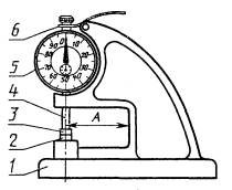 1 - корпус; 2 - пятка; 3 - измерительный наконечник; 4 - измерительный стержень; 5 - отсчетное устройство; 6 - арретир; А - вылет
