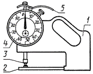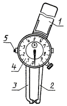 1 - корпус; 2 - неподвижный стержень; 3 - измерительный наконечник; 4 - отсчетное устройство; 5 - арретир