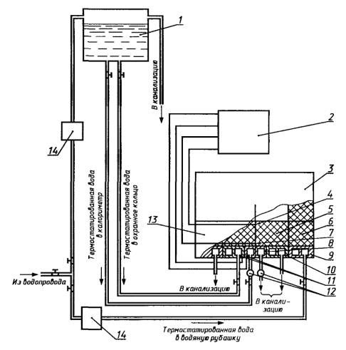 1 - водонапорный бак; 2 - прибор для измерения термоэдс; 3 - верхняя часть печи; 4 - термоэлектрический преобразователь платинородий-платиновый; 5 - образец; 6 - теплоизоляция боковой поверхности образца; 7 - термопреобразователь хромель-алюмелевый; 8 - калориметр; 9 - водяная рубашка; 10 - охранное кольцо; 11 - термопреобразователи хромель-копелевые; 12 - термометры для измерения повышения температуры воды в калориметре; 13 - нижняя часть печи; 14 - регулирующее устройство для поддержания заданной температуры воды