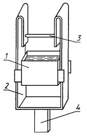 приспособление для намокания полосок бумаги (см. чертеж), состоящее из ванночки 1, которая может вертикально перемещаться по направляющим 2 и фиксироваться в верхнем положении, горизонтального стержня 3 диаметром (5,0±0,1) мм и длиной (25±1) мм и хвостовика 4 для закрепления приспособления в нижнем зажиме разрывной машины. При верхнем положении ванночки стержень должен опускаться в ванночку не менее чем на 25 мм, при установке на разрывной машине отклонение образующей стержня от параллельности относительно плоскости нижней кромки верхнего зажима не должно превышать 0,1 мм;