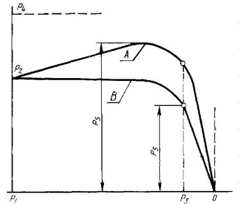 А - возрастающая характеристика; В - падающая характеристика; Р1 - наибольшее давление на входе; Р2 - наибольшее рабочее давление; Р3 - наименьшее давление газа на входе; Р4 - наибольшее рабочее давление при прекращении отбора газа через редуктор; Р5 - наибольшее (возрастающая характеристика А) или наименьшее (падающая характеристика В) рабочее давление при изменении давления газа на входе в редуктор от наибольшего (P1) до наименьшего (Р3) давления