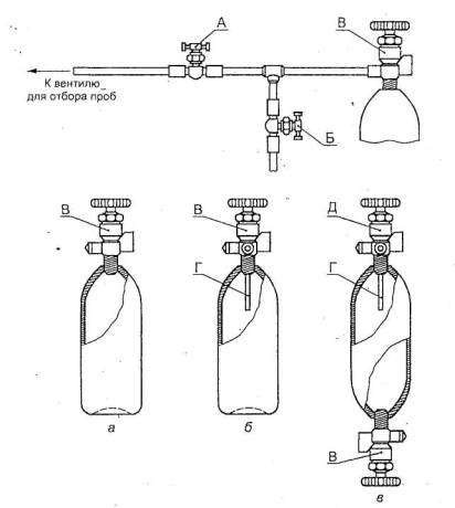 При использовании контейнера для проб с двумя вентилями его располагают вертикально вентилем Д вверх. Закрывают вентили Б и В и открывают Вентиль А (рисунок А.1). Открывают вентиль В и частично заполняют контейнер пробой, слегка открывая вентиль Д. Закрывают вентиль А и испарившуюся часть пробы выпускают через вентиль Д. Закрывают вентиль Д, переворачивают контейнер и, открыв вентиль Д, сливают остаток пробы в виде жидкости. Операцию повторяют не менее трех раз.