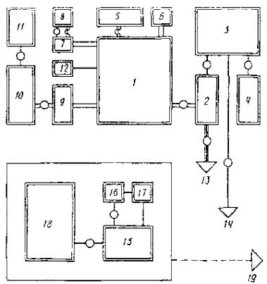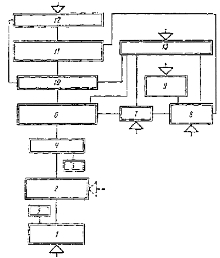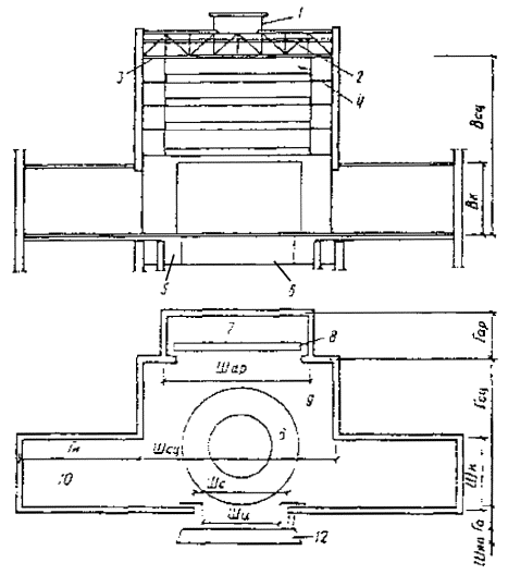 1 - группа входных помещений; 2 - группа рекреационных помещений; 3 - группа санитарно-гигиенических помещений; 4 - зрительный зал; 5 - помещения технологического обеспечения сцены; 6 - сцена, карманы, арьерсцена, авансцена; 7 - дежурные склады; 8 - склады текущего сезона; 9 - резервные склады; 10 - артистические уборные; 11 - репетиционные помещения; 12 - помещения для административного в художественного руководства и технического персонала; 13 - производственные помещения