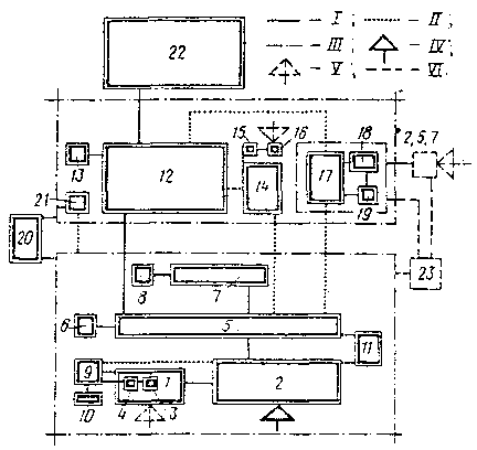 1 - кассовый вестибюль; 2 - входной вестибюль; 3, 4 - кабины касс и дежурного администратора; 5 - распределительный вестибюль; 6 - комната для переодевания; 7 - гардеробная; 8 - комната гардеробщиков; 9 - кабинет главного администратора и кладовая афиш; 10 - комната распространителей билетов; 11 - детская комната; 12 - фойе, кулуары; 13 - кладовая при фойе; 14 - буфет; 15 - моечная, доготовочная; 16 - кладовая, тарная; 17 - экспозиционное помещение музея; 18 - фондохранилище; 19 - комната (место) работы сотрудника; 20 - санитарные узлы; 21 - курительная; 22 - зрительный зал; 23 - клубные помещения; I - связи; II - варианты связей; III - блоки; IV - вход; V - возможный вход; VI - возможное помещение (связи)