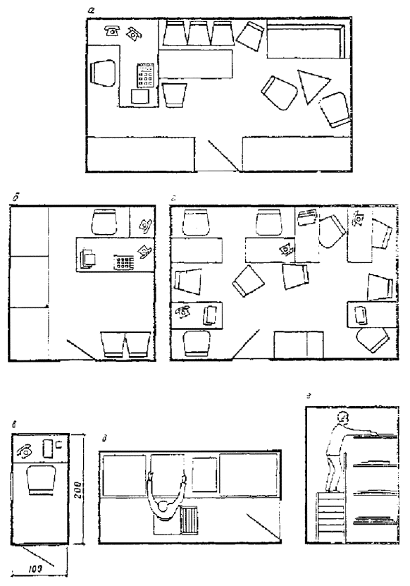 В качестве рабочих кабинетов может использоваться часть артистических уборных, а в качестве помещений для секции и комиссий - часть репетиционных залов. Их желательно оборудовать радио- и телефонной связью с президиумом и размещать вблизи сцены и зрительского комплекса.