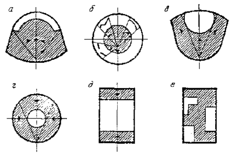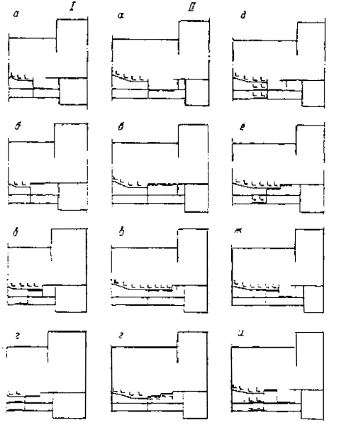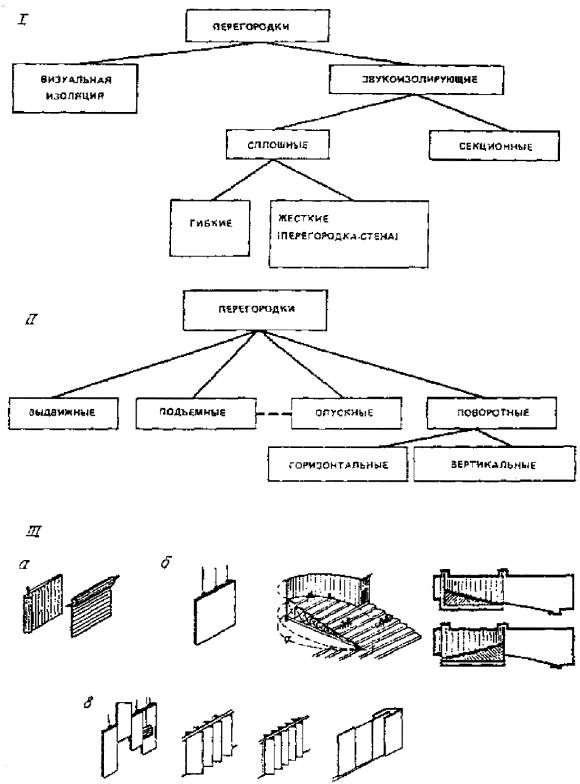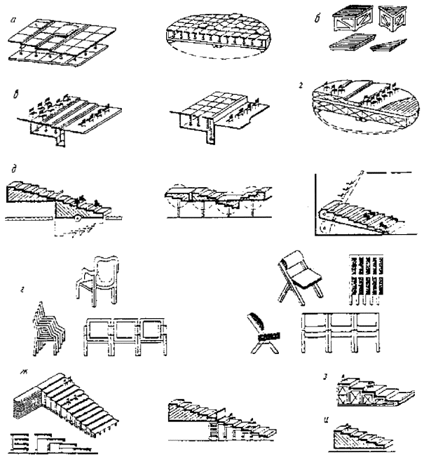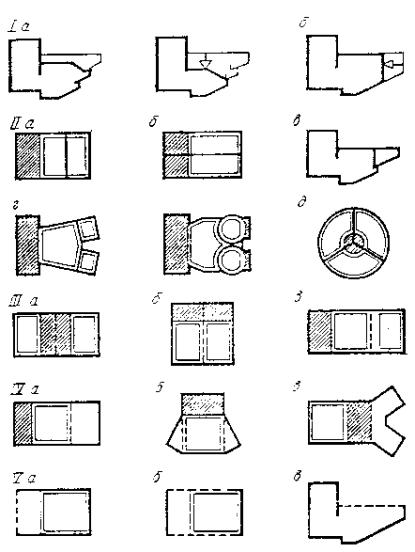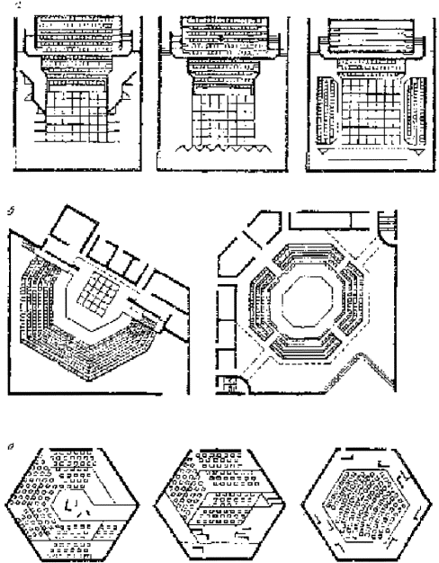 I - летний концертно-театральный зал (типы сцен: а - глубинная, изолированная от окружения; б - трехсторонняя - панорамная, открытая; в - глубинная-трехсторонняя-центральная закрытая, с трансформацией зрительских мест; г - глубинная-трехсторонняя с трансформирующимся задником); II - природный и историко-архитектурный театр (типы сцен: а - фронтальная протяженная, с несколькими сценическими площадками; б - кольцевая с вращающимся амфитеатром; в - трехсторонняя - кольцевая; г - комбинированная с широким фронтам соприкосновения с окружением; д - панорамная с природным или архитектурным фоном); III - кооперация сооружения (а - открытый амфитеатр с театром круглогодичного действия; б - открытый амфитеатр на крыше городского зала; в - открытый амфитеатр с закрытым танцевальным залом; г - несколько амфитеатров; 1 - сценическая площадка; 2 - сооружение иного назначения)