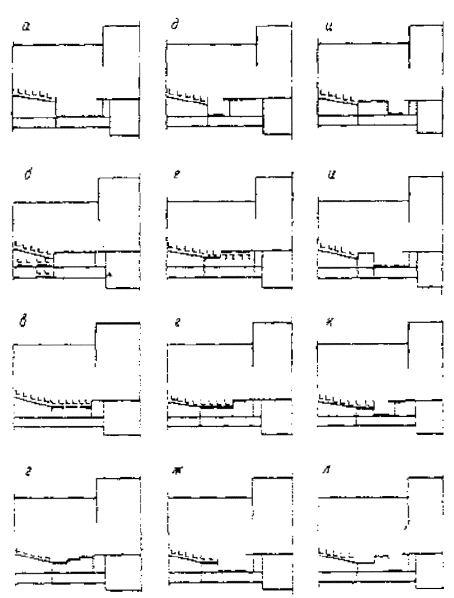 а - фойе без кулуаров; б - фойе с кулуарами и организацией из них входа в зал; в - фойе с кулуарами без входа из них в зал (в кулуарах - зоны отдыха, буфет, музей); г - фойе и вестибюль в разных уровнях; д - фойе (часть фойе) и вестибюль в одном уровне; 1 - зрительный зал; 2 - фойе; 3 - кулуары; 4 - вестибюль