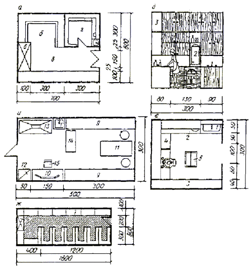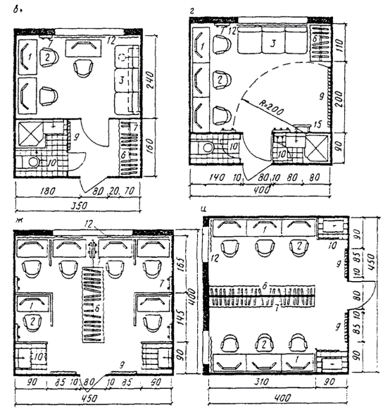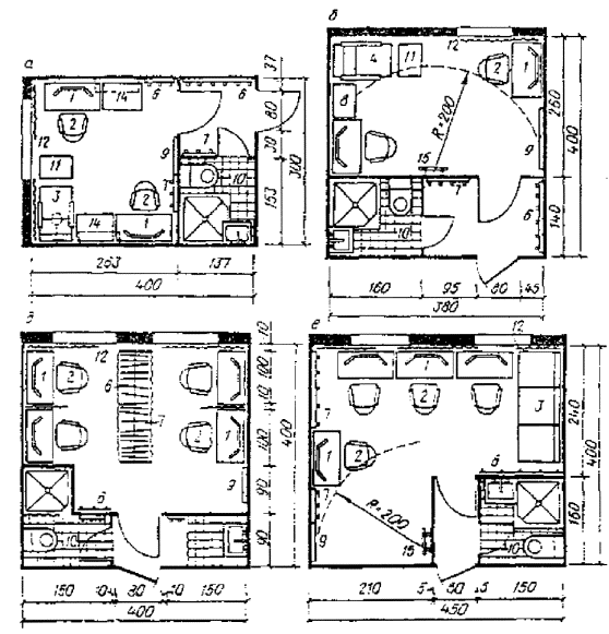 Кабины для инвалидов оборудуются специальными откидывающимися поручнями около унитаза и поручнями, жестко закрепленными на стенах кабины. Желательно наличие подвесной ручки над унитазом. Подход к унитазу инвалида проектируется свободным спереди и с обоих сторон унитаза. На стенке кабины на высоте 1,2 м устанавливаются крючки для одежды и костылей. Размеры кабин в свету составляют от 1,5´1,6 до 2,14´2,14 м.