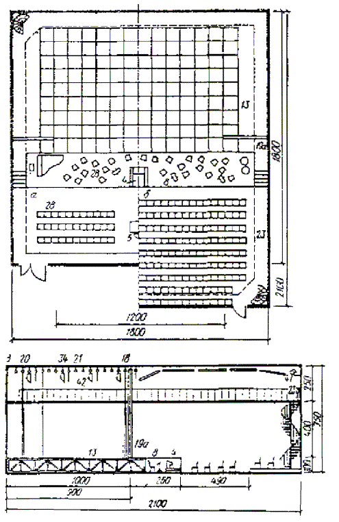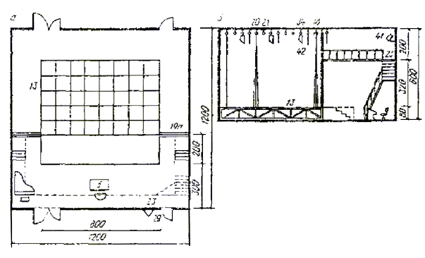 4. Комплекс помещений, обслуживающих сцену, целесообразно дополнить складом фур для президиума. Склад может размещаться на одном уровне со сценой или ниже ее, что в свою очередь определяет систему подачи мест президиума на сцену.