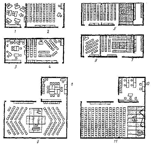 Общая функционально-планировочная схема связей помещений зрительского комплекса приведена на рис. 3. Возможные схемы построения помещений зрительского комплекса приведены на рис. 4.