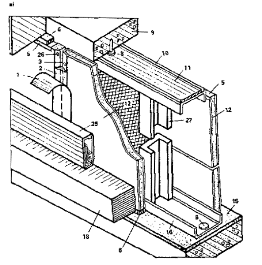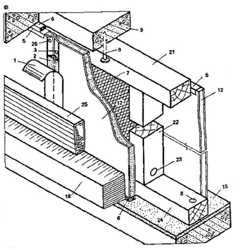 1 - тканевая или бумажная лента; 2 – шпатлевка; 3 - стык гипсокартонных листов; 4 - винты самосверлящие самонарезающие; 5 - обрамляющий профиль; 6 - пакля, смоченная в гипсополимерцементвом растворе; 7 - минераловатные или стекловатные плиты; 8 - дюбель-гвоздь; 9 - перекрытие; 10, 16 - верхняя и нижняя металлические направляющие из тонколистовой стали; 11 - резиновая прокладка; 12 - гипсокартонный лист (лицевой слой); 13 - металлическая стойка из тонколистовой стали; 14 - отверстия в стойках для пропуска проводки; 15 - выравнивающая стяжка; 17 - гипсокартонные листы (внутренний слой); 18 - пол; 19 - плинтус деревянный; 20 - шурупы или гвозди; 21. 24 - верхние и нижние направляющие деревянные (бруски 40´50); 22 - стойки деревянные (бруски 40´50); 23 - гвоздь, для крепления стойки; 25 - плинтус электротехнический; 26 - шуруп; 27 - стойка-швеллер асбестоцементный (с. 5-6).
