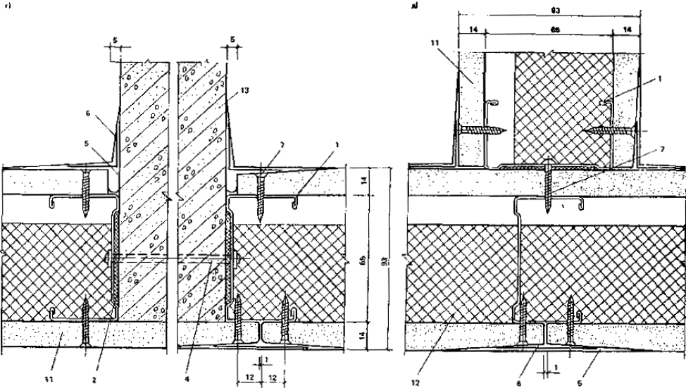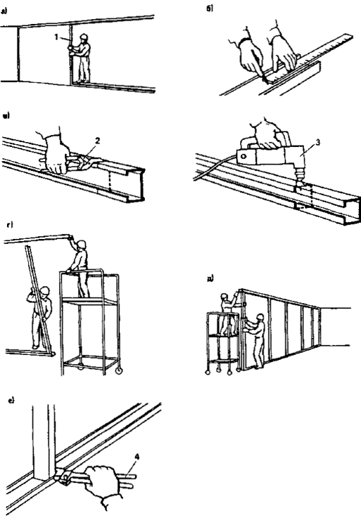 2.3. Каркас перегородок собирается из верхних и нижних направляющих и стоек. Верхние направляющие пристреливаются дюбель-гвоздями к конструкции потолка. Для компенсации возможных неровностей потолка между направляющей и потолком устанавливают упругие прокладки в виде полосы пористой резины толщиной 4 мм.