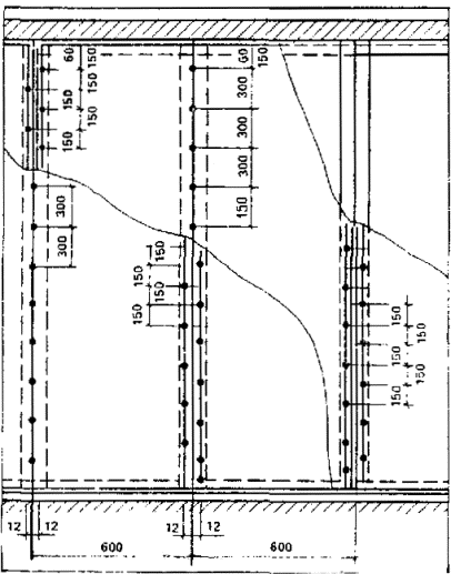 Асбестоцементные стойки устанавливаются в направляющие с шагом 600 мм. Гипсокартонные листы крепятся к асбестоцементным стойкам шурупами с шагом 300 мм.
