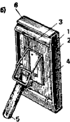 1 - рабочая поверхность; 2 - прокладка резиновая; 3 - устройство прижимное; 4 - основание; 5 - ручка; 6 - наждачная бумага