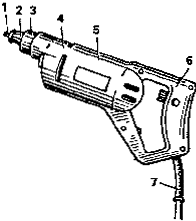 1 - отвертка; 2 - упор; 3 - ограничитель; 4 - корпус редуктора; 5 - корпус электродвигателя; 6 - рукоятка; 7 - кабель токопроводный