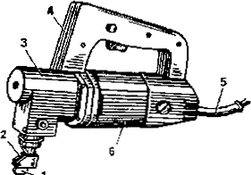 1 - нож подвижный; 2 - нож неподвижный; 3 - корпус редуктора; 4 - рукоятка; 5 - кабель токоподводящий; 6 - корпус электродвигателя