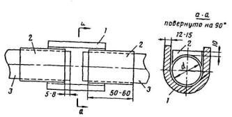 1 - сварное соединение; 2 - стальная скоба: 3 - накладка: 4 - протяжные швы; 5