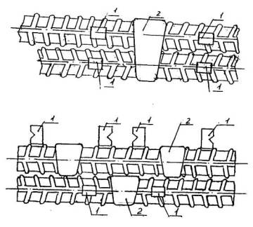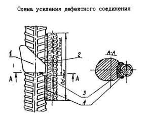 2. Для усиления дефектных соединений, отбракованных по баллу 2, следует использовать арматуру из стали той же марки, что и стыкуемые стержни. Площадь круглой накладки (накладок) назначается из условий статической прочности соединений, удобства сварки и должна составлять: