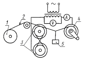 1 - катушка с проводом; 2 - испытуемый провод; 3 - металлические валики; 4 - зажимы; 5 - груз