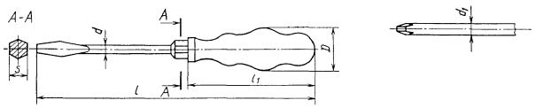 - тип 2 исполнений: 1 - для винтов и шурупов с прямым шлицем (черт. 3, табл. 3); 2 - для винтов и шурупов с крестообразным шлицем (черт. 3, табл. 3); 3 - двусторонние изогнутые для винтов с прямым шлицем (черт. 4, табл. 4); 4 - двусторонние изогнутые для винтов с крестообразным шлицем (черт. 5, табл. 5); 5 - для винтов и шурупов с прямым шлицем со стержнем круглого сечения с шестигранным поводком под ключ (черт. 6, табл. 6); 6 - для винтов и шурупов с крестообразным шлицем со стержнем круглого сечения с шестигранным поводком под ключ (черт. 6, табл. 6); 7 - со стержнем квадратного сечения для винтов и шурупов с прямым шлицем (черт. 7, табл. 7); 8 - для винтов и шурупов с прямым шлицем с деревянной ручкой (черт. 8, табл. 8); 9 - для винтов и шурупов с прямым шлицем с накладками (черт. 9, табл. 9).