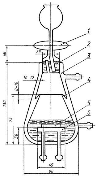 аппарат АКАТ-1 или прибор из термостойкого стекла (см. чертеж), представляющий собой двухстенную колбу, во внутренней части которой находится полая стеклянная площадка 6 для размещения металлической пластинки 5. Площадка охлаждается циркулирующей водой. Колба закрывается пробкой 1, имеющей гидравлический затвор 2 для поддержания нормального давления при испытании. Внутри колбы имеется желобок 4, в него заливают дистиллированную воду, которая испаряясь создает максимальную влажность воздуха внутри колбы и насыщает топливо водой. По межстенному пространству 3 прокачивается жидкость для подогрева топлива (вода, масло или глицерин в зависимости от условий опыта). Вместимость колбы 150 см3, соотношение объема топлива к объему воздуха в колбе 2:3 (60 см3 топлива и 90 см3 воздуха).