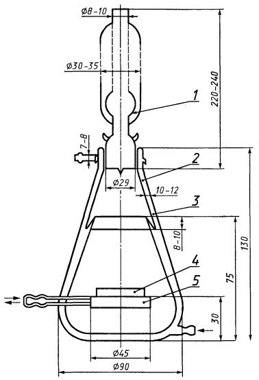 1 - водяной холодильник; 2 - межстенное пространство; 3 - желобок; 4 - металлическая пластинка; 5 - стеклянная площадка для размещения металлической пластинки