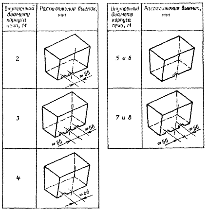На черт. 2 приведены пять комбинаций выемок, использующихся для маркировки кирпича в зависимости от диаметра печи.