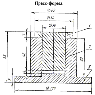 6 - 8 г подготовленной пробы помещают в фарфоровую кастрюлю и нагревают на электроплитке до температуры плавления шеллака (60 ± 5) °С. К нагретому коксу прибавляют предварительно измельченный и просеянный через сито с сеткой № 1 шеллак в количестве 1/3 - 1/2 объема кокса. Смесь по мере плавления шеллака тщательно перемешивают шпателем до образования однородной массы. Полученную массу помещают в пресс-форму (см. чертеж) и прессуют вручную с помощью плунжера в течение 10 - 15 с. Снимают матрицу с основания и плунжером выталкивают из нее готовый штабик. Для анализа из каждой пробы готовят два штабика. Допускается готовить один штабик, подвергая обработке оба торца штабика, как указано ниже, и анализируют каждый шлиф самостоятельно. Штабики хранят в пакетах из плотной бумаги по ГОСТ 2228-81, ГОСТ 8273-75 или из другой, обеспечивающей сохранность пробы.