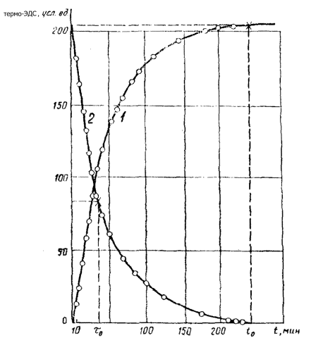 1 - кривая нагревания калориметра; 2 - кривая охлаждения калориметра