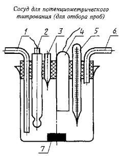 1 - вход раствора; 2 - электрод стеклянный; 3 - микробюретка; 4 - электрод сравнения; 5 - термометр; 6 - выход раствора; 7 - мешалка |
