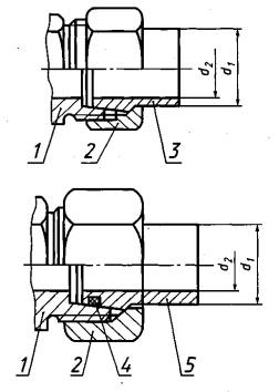 1 - конец корпусной детали с углом конуса 24° - по ГОСТ 22525; 2 - накидная гайка по ГОСТ 23353; 3 - конический ниппель исполнения 1; 4- резиновое кольцо круглого сечения по ГОСТ 9833; 5 - конический ниппель исполнения 2