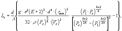 где d - диаметр выходного сечения ЗПУ, м; Ро - начальное давление в газовой полости баллона модуля, кгс·м-2; Р1 - конечное давление в газовой полости баллона модуля, кгс·м-2; Vo = (Vг - Vв) - начальный объем газовой полости баллона модуля, л; Vг - объем баллона модуля, м3; Vв - объем воды, заправленной в баллон модуля, м3;  - время выпуска не менее 95 % массы воды, с;  - плотность воды при условиях испытания, кг·м-3; К = 1,4 - показатель адиабаты для азота; g = 9,81 - ускорение свободного падения, м·с-2; - коэффициент сопротивления; Кэ - эквивалентная абсолютная шероховатость сифонной трубки и ЗПУ; Rэ - критерий Рейнольдса.