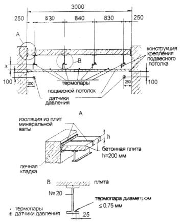 Термопары крепятся в нижней части балок, одна термопара размещается в середине балки, а две другие - на расстоянии 750 мм от середины.