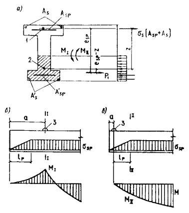 ssp, s¢sp - предварительные напряжения соответственно в напрягаемой арматуре S и S¢ до обжатия бетона (при натяжении арматуры на упоры) или в момент снижения величины предварительного напряжения в бетоне до нуля воздействием на элемент внешних фактических или условных сил, определяемые, согласно указаниям пп. 1.15, 1.19 и 1.20, с учетом потерь предварительного напряжения в арматуре, соответствующих рассматриваемой стадии работы элемента;