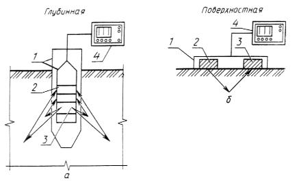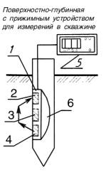 поверхностно-глубинную - измерительный преобразователь и источник ионизирующего излучения прижимают к боковой поверхности скважины или обсадной трубы для измерения плотности грунта в слое толщиной до 120 мм.