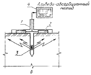 2.7. При измерении плотности грунта альбедо-абсорбционным методом применяют схему измерений (черт. 2в), при которой источник ионизирующего излучения погружают в грунт, а измерительный преобразователь помещают на поверхности грунта - для измерения средней плотности грунта в слое между источником ионизирующего излучения и измерительным преобразователем.