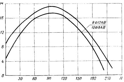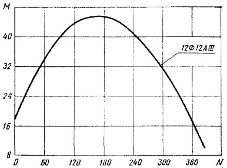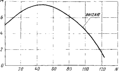 6. Если точка с координатами М и N лежит ниже кривой, соответствующей принятому армированию сваи или сваи-оболочки, то выбранная свая или свая-оболочка удовлетворяет расчету по прочности и раскрытию трещин на эксплуатационные нагрузки М и Л, если точка лежит выше - не удовлетворяет.