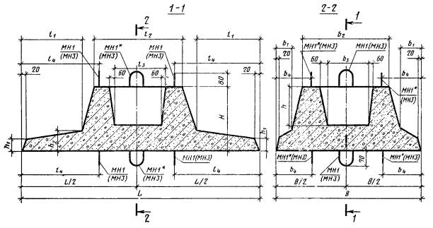 1.3. Форма, размеры фундаментов и расположение монтажных петель должны соответствовать указанным на чертеже и в табл. 1