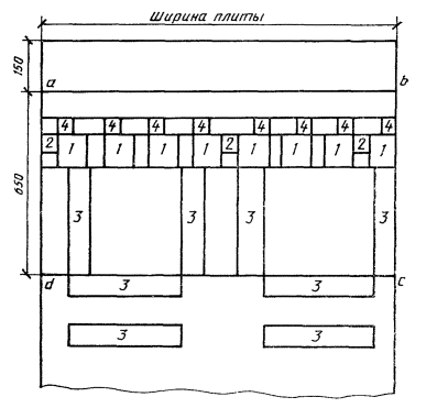 1 - образцы для определения плотности, разбухания по толщине за 24 ч и водопоглощения; 2 - образцы для определения влажности; 3 - образцы для определения предела прочности при изгибе; 4 - образцы для определения прочности при растяжении перпендикулярно к пласти плиты; abсd - образец для определения отклонения от плоскостности.