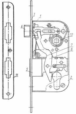 Деталь замка, завертки или задвижки, служащая для обеспечения запирания дверей или окон посредством входа в запорную планку (черт. 1, 3, 4, поз. 5) |