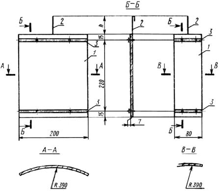 1 - кассета, изогнутая по кривизне барабана; 2 - подвеска кассеты; 3 - пластинка для крепления образца; h - высота подвески в соответствии с размерами зоны облучения.